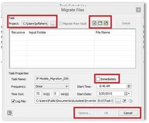 When you open Inventor’s Task Scheduler application, you’ll notice a number of different processes it will run for you. For this, we want to focus on the Migrate task. This process will take the file you designate and run it through a “clean-up” process that will clean and organize/compact your file once completed.